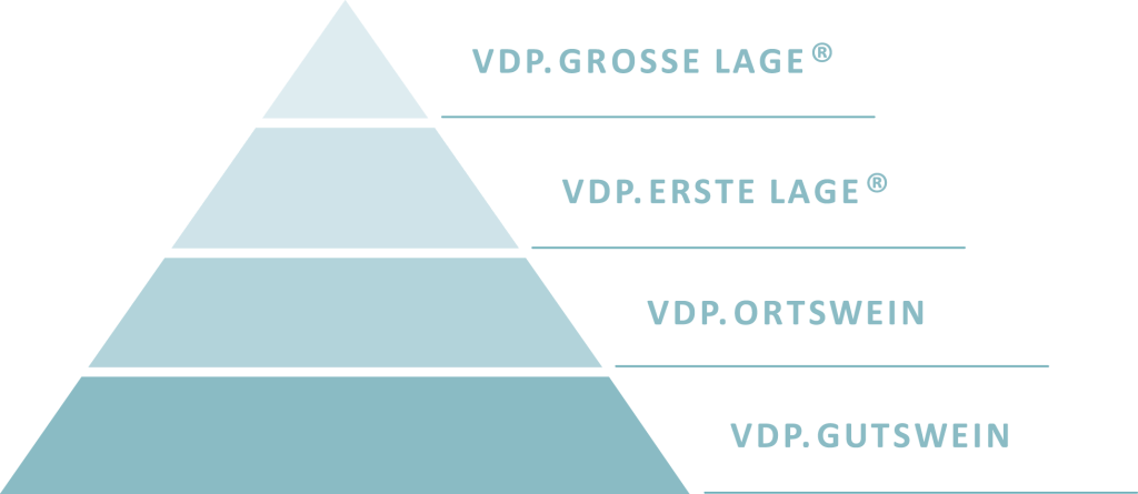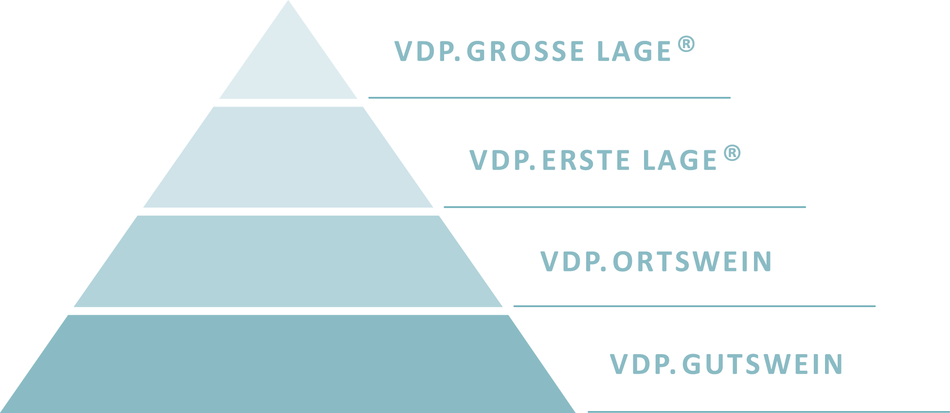 In the years leading up to and during the deliberations about the 1971 German Wine Law, there was an effort by the DWV (German Viticulture Association) to remove the term “natur” (natural) from the official wine lexicon. Despite efforts by the VDNV, “natur” was removed and replaced by the concept “Qualitätswein mit Prädikat” (Quality Wine with Special Attributes). After the abolition of the term “natural wine,” the VDNV and several regional associations were considering disbanding. Under the impression of a passionate speech by Peter von Weymarn, owner of the Niersteiner Heyl zu Herrnsheim winery, sixteen representatives of the only 75 member companies shy away from this step at the last minute, and he is able to avert the disbanding of the traditional association. The result: a new headquarters, a new name (Verband Deutscher Prädikatsweingüter – VDP), a new constitution, a new president (Peter von Weymarn, Nierstein), and higher demands on membership. From this day forward, the focus of the brand new VDP would be to not only improve the quality of German wine in general, but also to, and perhaps more importantly, improve the perception of quality in the eye of the consumer. These efforts would culminate in January 2012 with the presentation of the pyramid of quality, four distinct levels of quality, giving prestige to each one. Looking at the pyramid designed by the VDP, one can understand how the classification works. Also, it’s important to keep in mind that the VDP’s classifications do NOT replace German wine law! They are additional indications of quality.